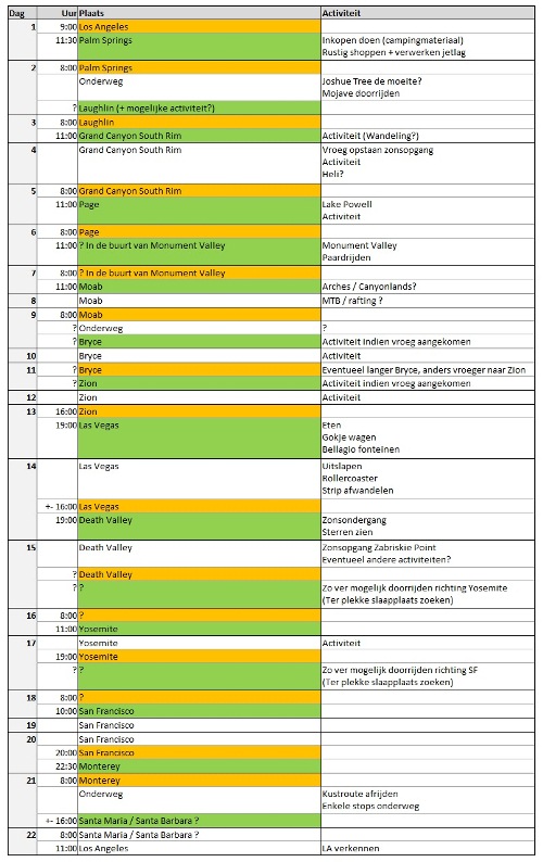 Ik plaats zo meteen een ander overzicht in de vorm van dat van Pete. We komen één keer 's morgens aan in Yosemite en kunnen daar de hele dag doorbrengen. We overnachten dan in Yosemite en vertrekken pas 's avonds richting SF ... dat zijn in principe twee dagen die we in Yosemite doorbrengen. We hebb...