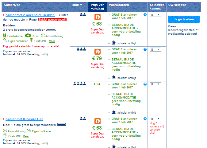 Verder wordt ik persoonlijk gek van de opmaak van booking (welk tarief boek je nu, zet er nu wel of geen belasting bij, of wordt die later verrekend, de ONLY 2 ROOMS LEFT meldingen).