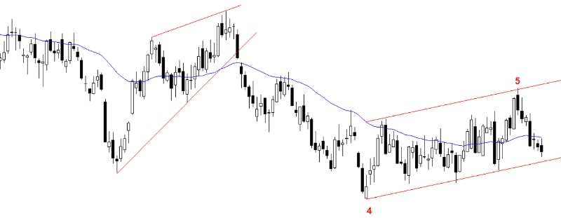 In de weekgrafiek zie je dat de koers sinds een jaar onder het dalend evg beweegt, een dalende trend dus. Zo'n trend gaat niet in een rechte lijn. Ook in een dalende trend komen (korte) stijgingen voor, waarbij de koers naar het evg terugkeert. Zo'n countertrend in de weekgrafiek zie je vaak duidelijker in de daggrafiek.