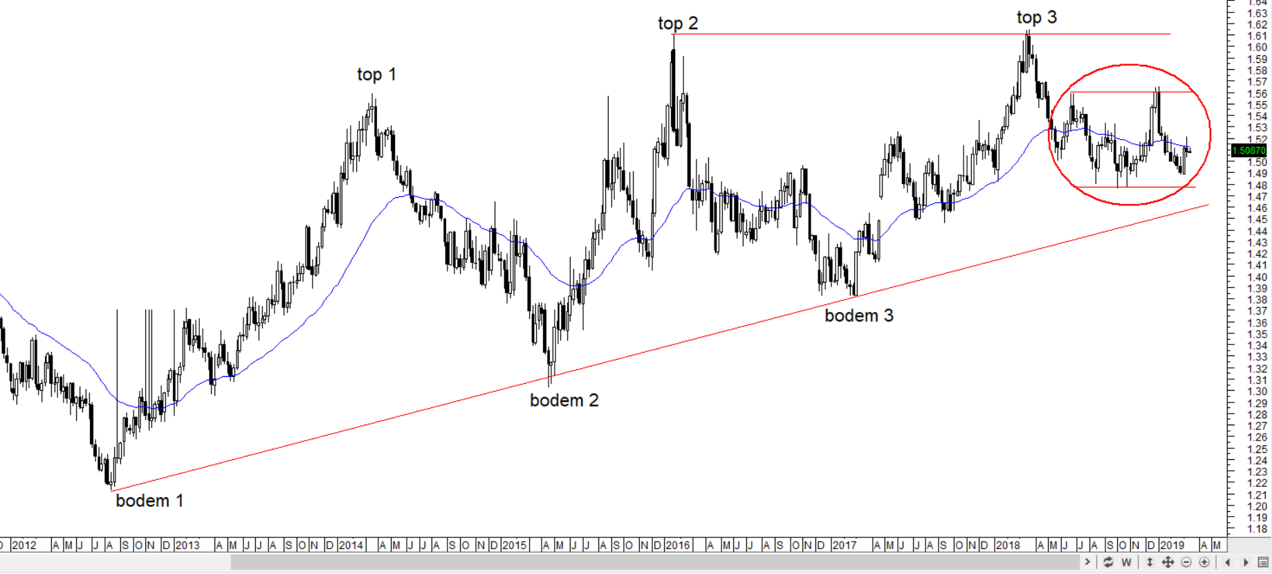 Na de daling vanaf top 3 lijkt de laatste weken een zijwaartse beweging tussen 1,476 en 1,565 (cirkel) te ontstaan. Het laagste punt van deze beweging ligt net boven de opgaande lijn door de drie bodems. Zolang de koers hierboven blijft, is er kans op een stijging naar 1,615, het niveau van top 3. Licht negatief is dat de koers momenteel weerstand van het 40 weeks exponentieel voortschrijdend gemiddelde ondervindt.