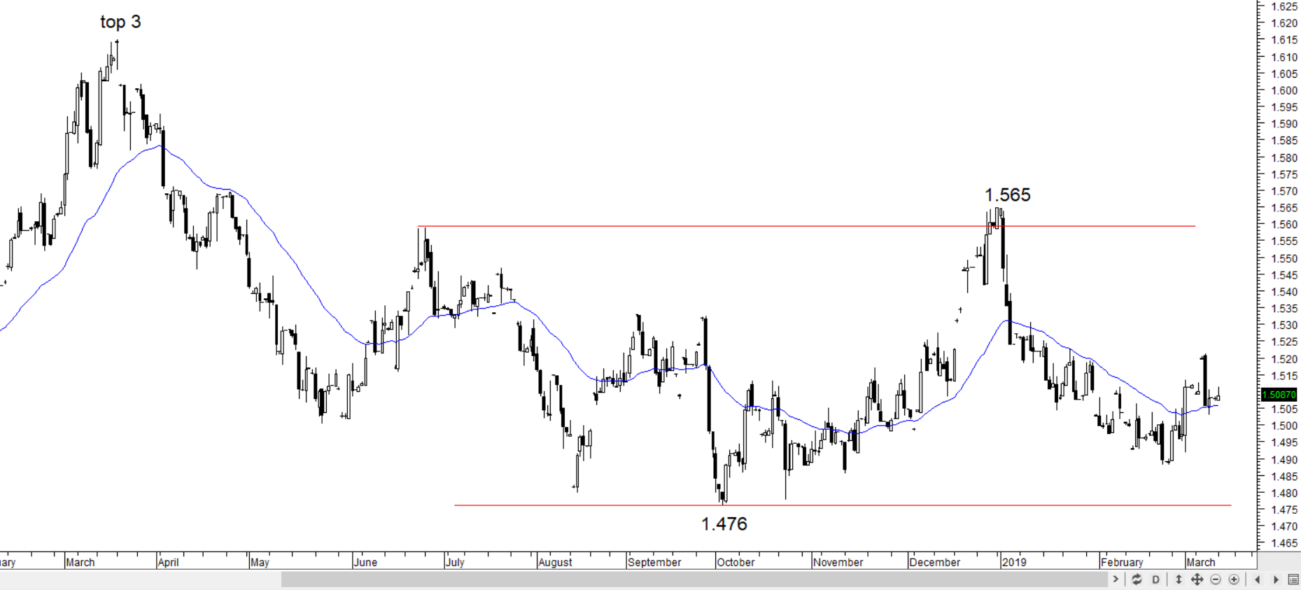 In de daggrafiek zien we dat de daling na top 3 eindigde op 1.476, waarna een stijging naar 1,565 volgde. Daarna volgde een daling maar inmiddels is de koers weer boven het 40 daag exponentieel gemiddelde gekomen. Als de koers hierboven weet te blijven, ligt een stijging naar 1,565 de komende weken voor de hand en hierboven naar 1,615. Dit scenario komt in gevaar bij een daling onder 1,476. Zeker als ook de opgaande trendlijn door de drie bodems uit de weekgrafiek daarbij gebroken wordt.