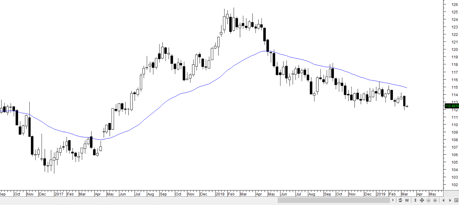 Dat bleek voorlopig het dieptepunt te zijn. Sindsdien is de koers (licht) gestegen tot het 40 weeks exponentieel voortschrijdend gemiddelde. Het is echter nog te vroeg om te concluderen dat de dalende trend in deze weekgrafiek ten einde is.