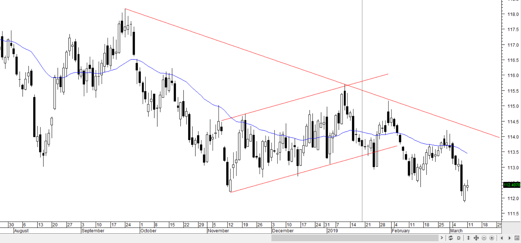 Conclusie: De laatste maanden zien we een zijwaartse beweging tussen 1,13 en 1,185. Ik acht de kans op een uitbraak aan de onderkant vrij groot: het evg daalt duidelijk, de koers bleef wekenlang met moeite boven 1,13 en het herstel in de vorm van een vlag dreigt in de weekgrafiek op het evg40 af te ketsen. Zolang de uitbraak onder 1,13 nog niet heeft plaatsgevonden, is een stijging richting 1,185 niet uit te sluiten.