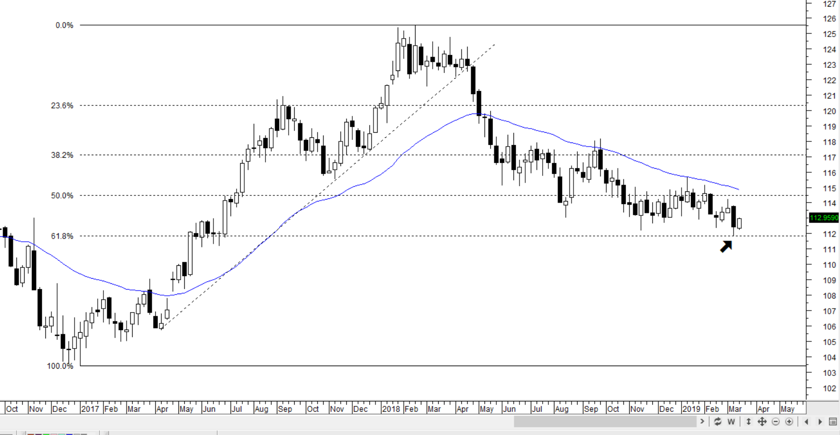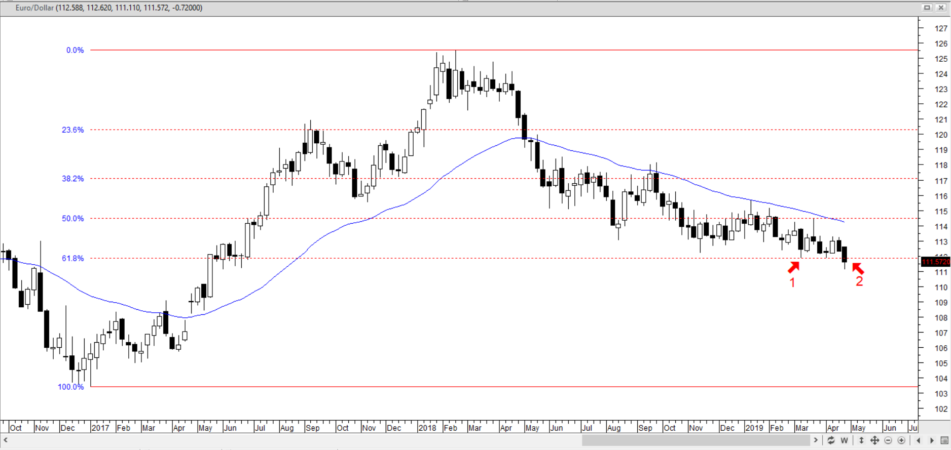 In 2018 bereikte de euro in februari een hoogste koers van ruim 1,25 (1). Daarna volgde een snelle daling, die in augustus bij 1,13 stokte (2) stokte. Daarbij kwam de koers ook duidelijk onder het 40-weeks exponentieel voortschrijdend gemiddelde. Daarna volgde een kort herstel, waarbij de koers er niet in slaagde boven dat evg40 te komen (3). Bij de volgende daling dreigde de koers enkele weken onder de 1,13 te komen maar dit gebeurde niet definitief (4). Daardoor ontstond een zijwaartse beweging tussen ruwweg 1,13 en 1,185. Het laatste herstel dreigt echter al snel weer op het dalende evg40 af te ketsen (5).