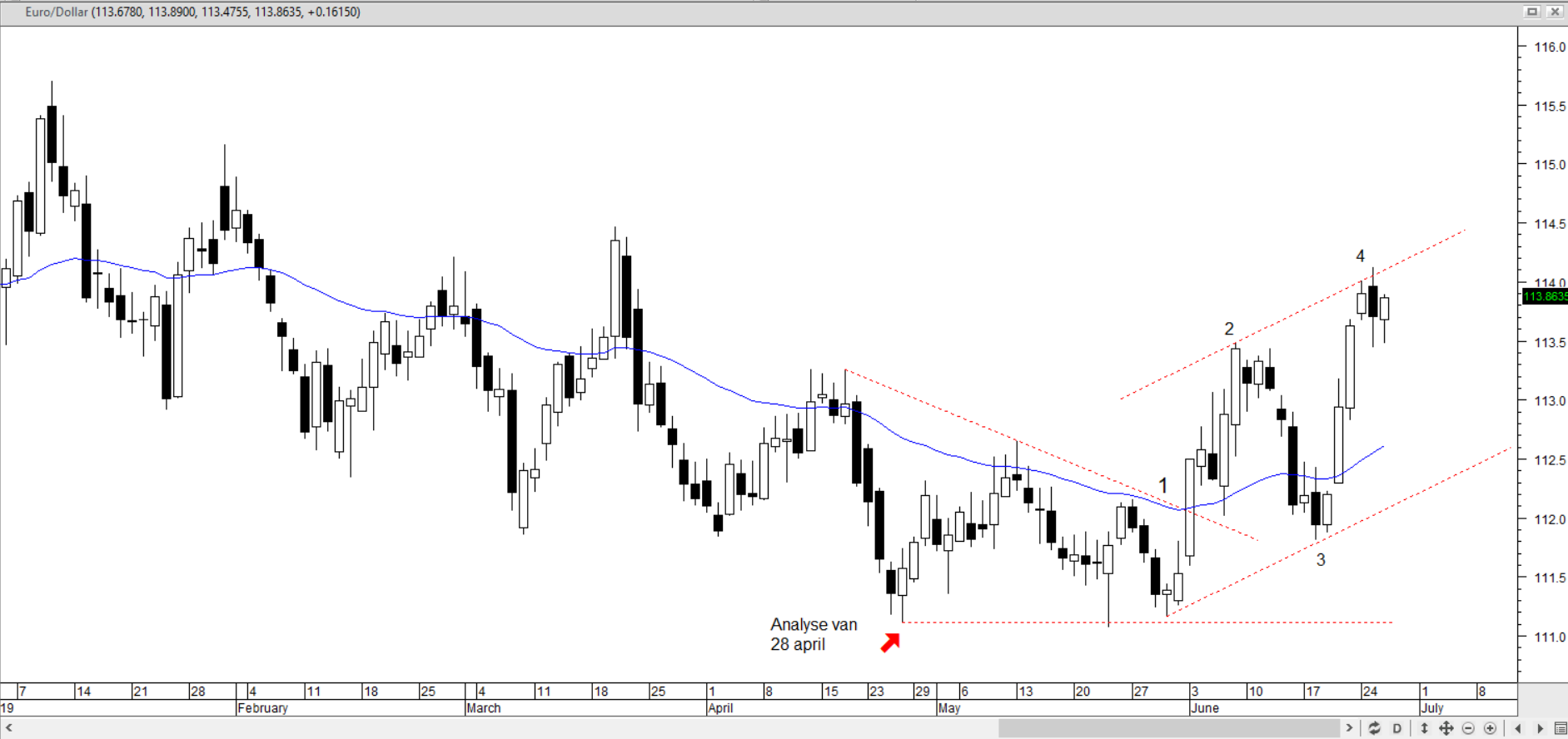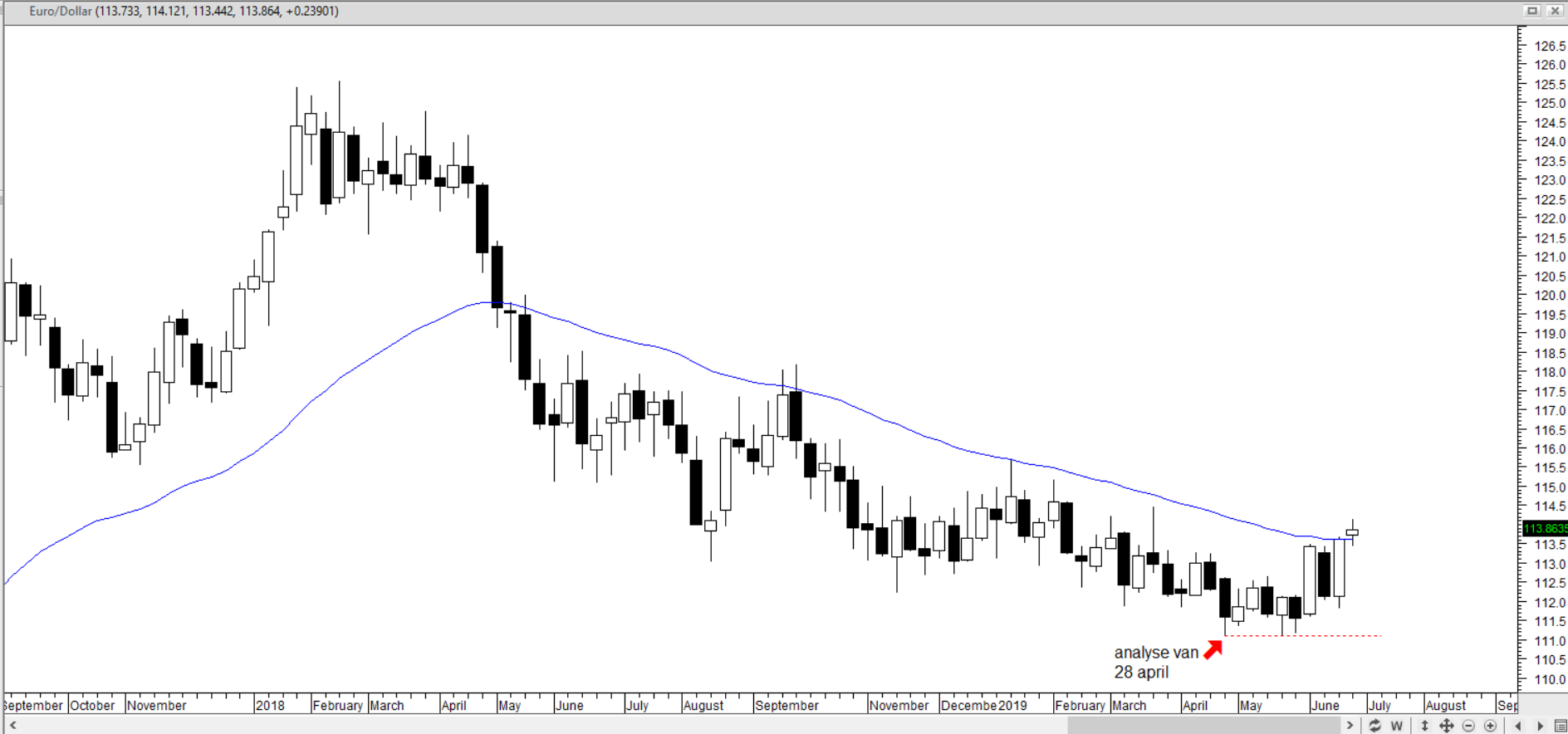 In de daggrafiek is te zien dat de koers na 28 april nog twee keer een lagere top maakte maar in mei niet meer onder het niveau van eind april kwam. In juni ging de koers stijgen: