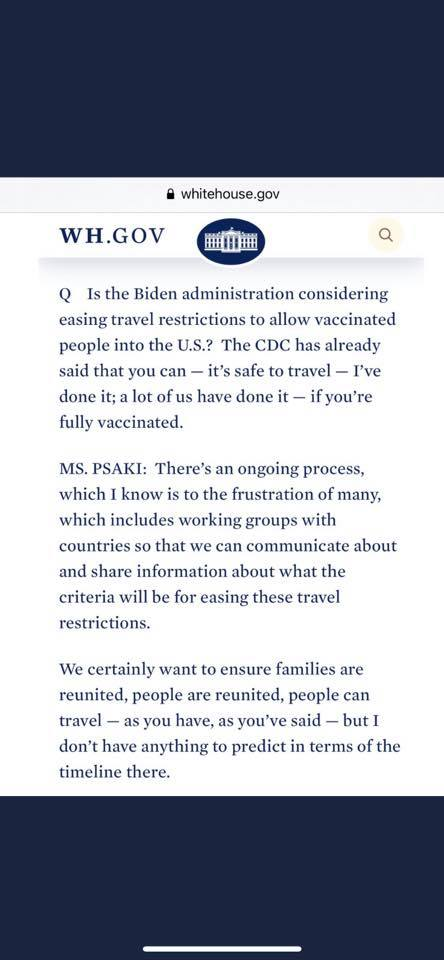 Weer een minister binnen het kabinet van Biden die zich uitspreekt dat het tijd wordt om de travel ban op te heffen. Als we het bericht mogen geloven dan zou de voornaamste reden van oponthoud zijn dat: "There's no vaccine passport that's reliable, and that's kind of a big hurdle."