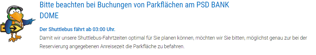 Ik heb een berichtje gestuurd naar Parkvogel over de shuttle tussen PSD Bank Dome en de luchthaven. Zij geven aan dat de maximale wachttijd 30 minuten is.
