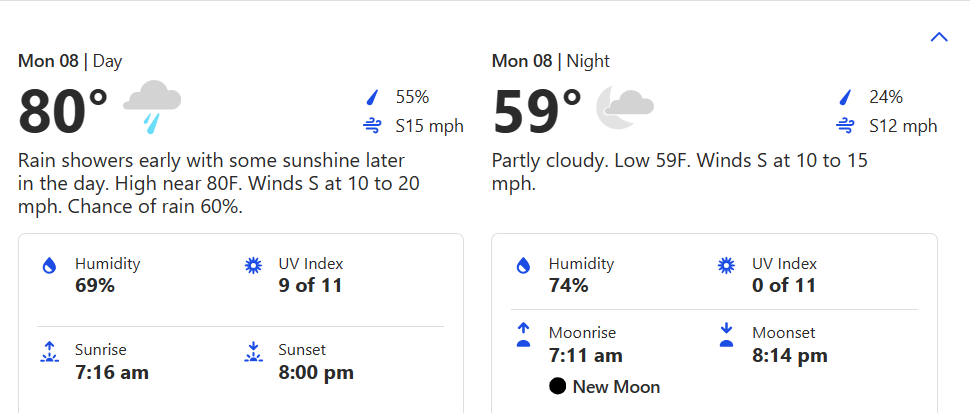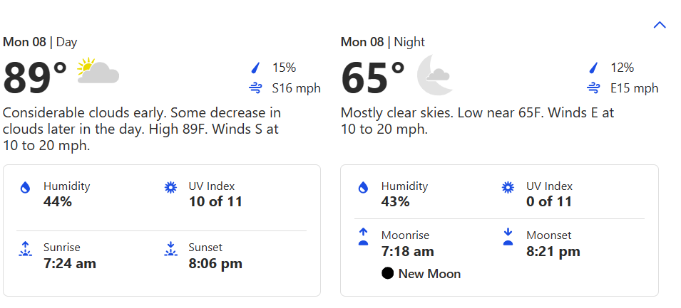 Over tien dagen wordt op ons verzoek de zon verduisterd in Amerika. Ons plan is om dit in Kerrville in Texas mee te maken. Ik heb even naar de tiendaagse weersverwachting gekeken en dat ziet er eerlijk gezegd niet zo goed uit. "AM Showers" luidt de kop op Weather Channel;