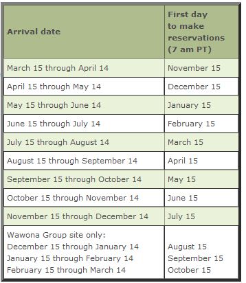 Ik ben bang dat ik wat te optimistisch was over dat vooraf boeken. Wij hebben al twee keer overnacht op North Pines Campground in Yosemite Nat'l park en dat van die enkele minute klopt. De eerste keer voor ons was 09/2003 en de tweede keer in 06/2009. We gaan nu op 27 juni 2012 naar Yosemite. We kunnen dan pas op 15-02-2012 reserveren. Voor andere parken gelden andere regels.