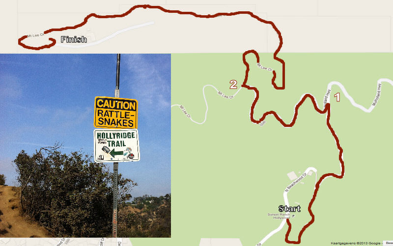 - BESCHRIJVING WANDELING: De wandeling naar het Sign begint eigenlijk de verkeerde kant op. Loop omhoog naar het bord met de ratelslang waarschuwing en volg vanaf daar de route. Ik heb het bord Holy Ridge Trail daarna niet veel meer gezien, dus zorg dat je bij nr 1 op het routekaartje ook echt linksaf omhoog gaat. Rechtdoor is een hele lange trail naar Griffith Obs. Maargoed we gaan omhoog en komen op een aantal plateaus wat al een leuk uitzicht bied over het sign. Daarna nog een lekkere klim en bij 2 kom je Mt Lee road op. Deze weg slingert zich om de heuvel heen. Aan de ander kant heb je een geweldig uitzicht (mits het goed weer is) over The Valley! Je loopt bovenlangs forest lawn, Warner Brother Studio's. in de verte Bob Hope Airport. Bijna op het einde begint nog een andere trail naar Cahuenga Peak. Dan het hoekje om en je staat achter een hek boven het Hollywood Sign. Loop overigens een stukje verder bij het hek naar links het heuveltje op, dan sta je namelijk boven het hek ;)