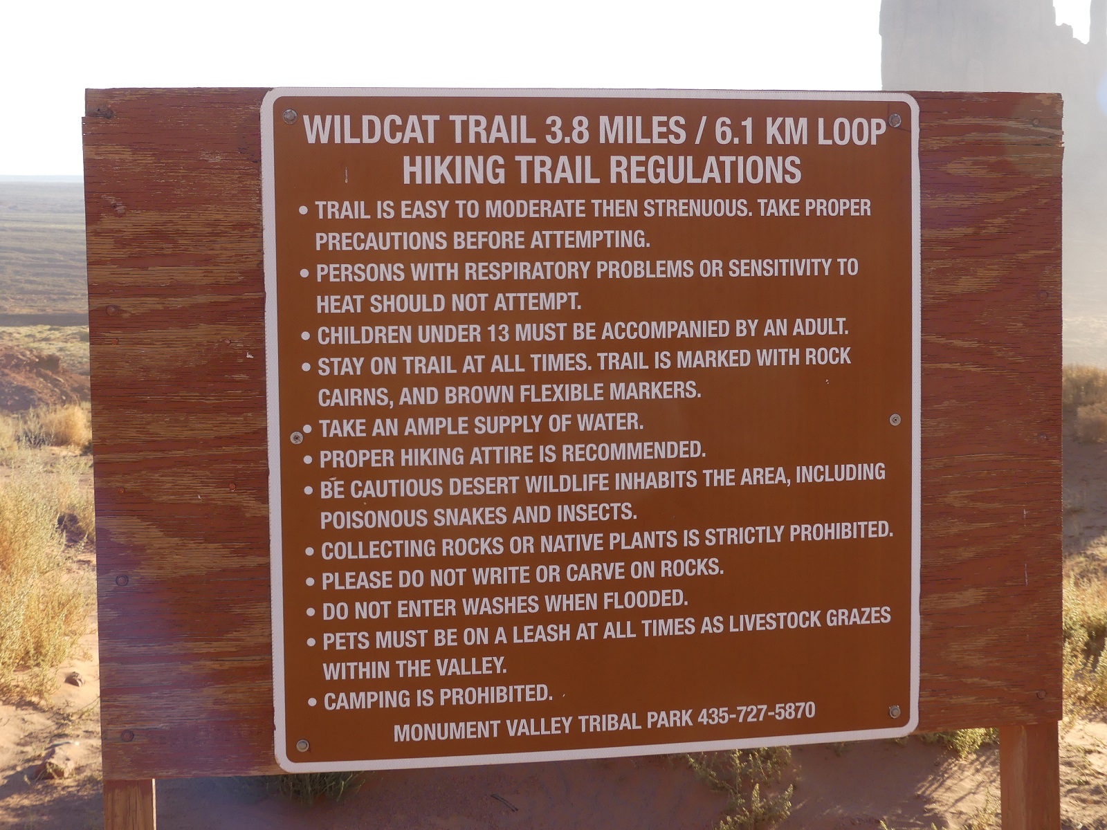 De Wildcat Trail is de enige wandelroute in Monument Valley. Je loopt rond de West Mitten, een van de beroemde buttes in de vallei, met telkens weer andere uitzichten op de andere buttes. De trailhead ligt vlak naast het begin van de bekende Valley Drive, iets ten westen van de parkeerplaats. Als het erg heet is, is het verboden om de wandeling te lopen. In de zomer is het alleen in de vroege ochtend te doen.