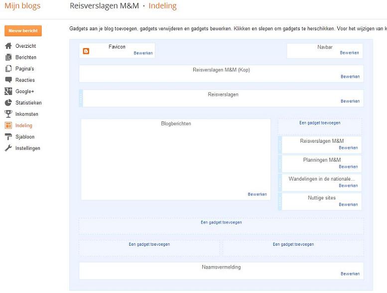 Ten eerste moet je onder indeling een gadget toevoegen. Dat wijst zich vanzelf. Je krijgt dan een lange lijst, waar je moet kiezen voor "lijst met links". Hierin kun je dan de titel invullen (wat bij mij dan Reisverslagen M&M is) en dan de naam van de link aangeven en de url waarnaar de link moet verwijzen. Voor je reisverslagen de link van het betreffende verslag opgeven. Het is handig om je reisverslagen open zetten. Dan kopieer je de link van het laatste verslag naar je nieuwe overzicht. Zo geef je een voor een de links op. Je kunt dan later eventueel de volgorde nog veranderen.