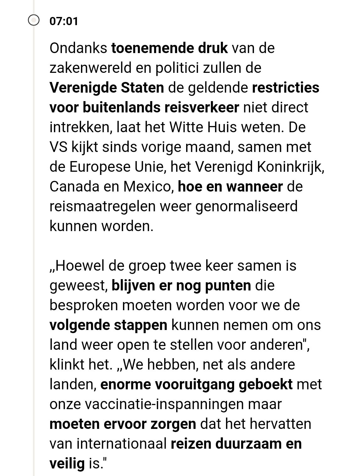 Geen verrassing eerlijk gezegd voor mij, die versoepelingen voor de EU gaan op zijn vroegst pas komen na het vakantieseizoen voor de Amerikanen en Canadezen zelf. En met het oog op het opleven van de Delta variant in Europa zal dat eerder later dan vroeger zijn ben ik bang.