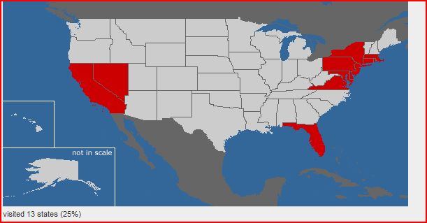 Na 12 keer nog niet veel bezocht omdat we meerdere keren naar hetzelfde zijn gegaan. Ik denk niet dat mijn kaart vol komt want ik zou niet weten wat ik in sommige staten zou moeten doen. :wink: