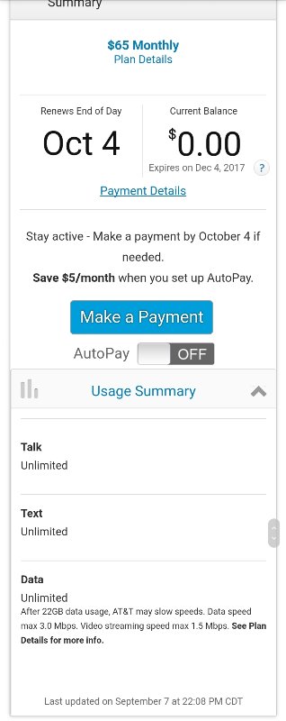 Het plan is overigens niet $60, maar $65 per maand. $60 is het alleen als je autopay opzet.Unlimited Data. Data speed limited to max of 3Mbps. For content we can identify as video, speed will be limited to a max of 1.5Mbps at Standard Definition quality (about 480p). After 22GB of data usage, AT&T may slow speeds. See att.com/broadbandinfo for details. Mobile hotspot use is prohibited.
