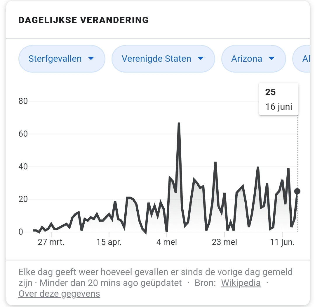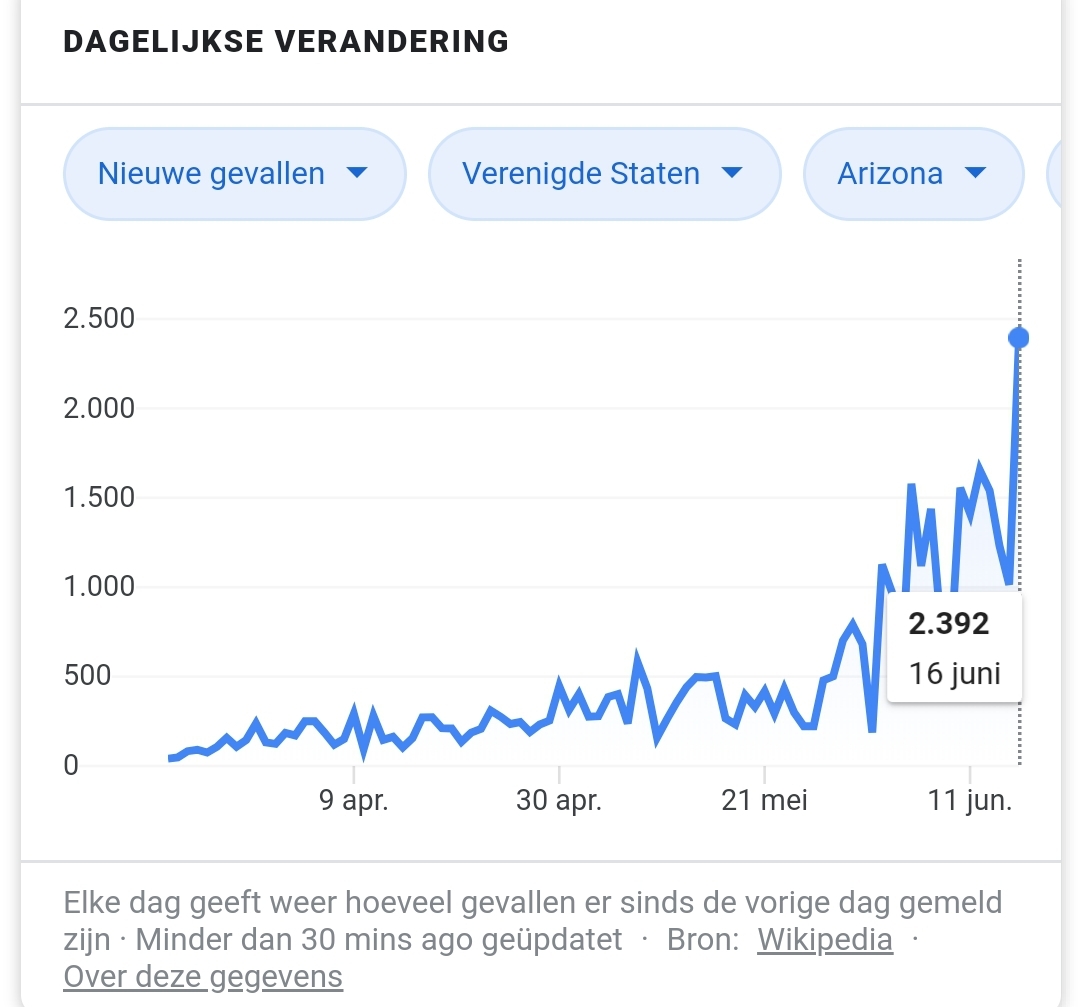Ik denk dat je hier de bal toch misslaat... in België en Nederland liggen het dagelijks aantal besmettingen rond de 100 nu en in Arizona was het gisteren 2300 ( op maar 7 miljoen inwoners en een gebied dat 10 keer groter is dan België). Als je hier realistisch naar kijkt ziet het er allesbehalve rooskleurig uit daar.Nessiezzz schreef: ↑17 jun 2020, 15:29