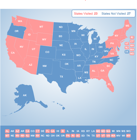 Ik heb na onze vorige trip ook nog eens een nieuw kaart aangemaakt en kom inmiddels op 29 staten uit. Eerlijkheidshalve moet ik bekennen dat er staten bijzijn waar we niet echt op bezoek geweest zijn maar doorheen gereden. Overstappen met het vliegtuig tel ik niet mee