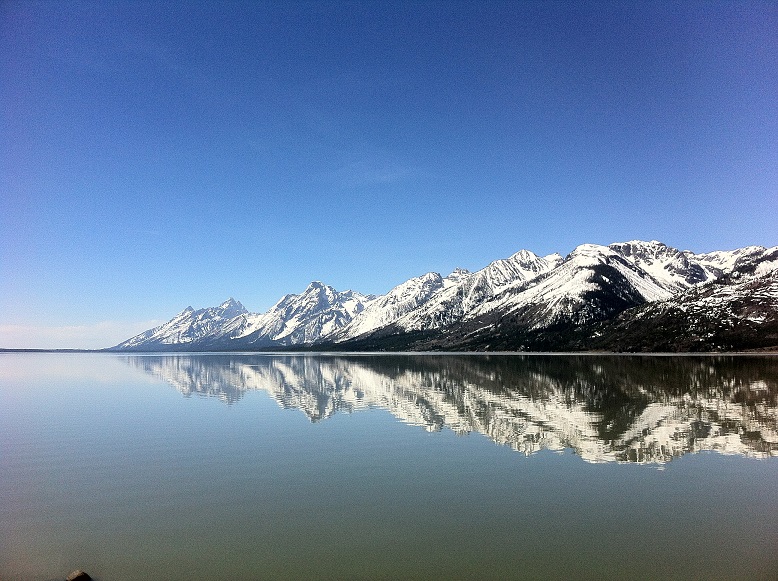 - De witte toppen van de Tetons die onder een strakblauwe lucht weerspiegelden in het Jackson Lake. Prachtig !