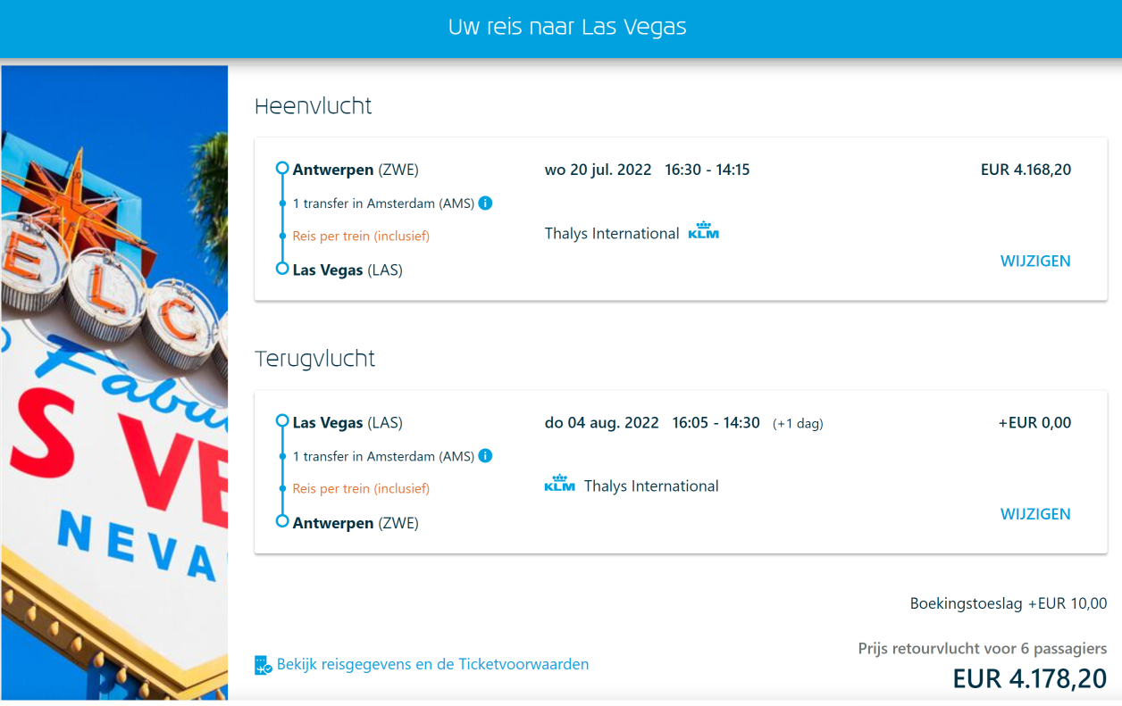 Net even gekeken en onderstaand voorbeeld van KLM.nl gehaald. Tickets zijn incl bagage (regulier economy). De route vanaf Antwerpen scheelt €530 per ticket (dit voorbeeld met fictieve data).