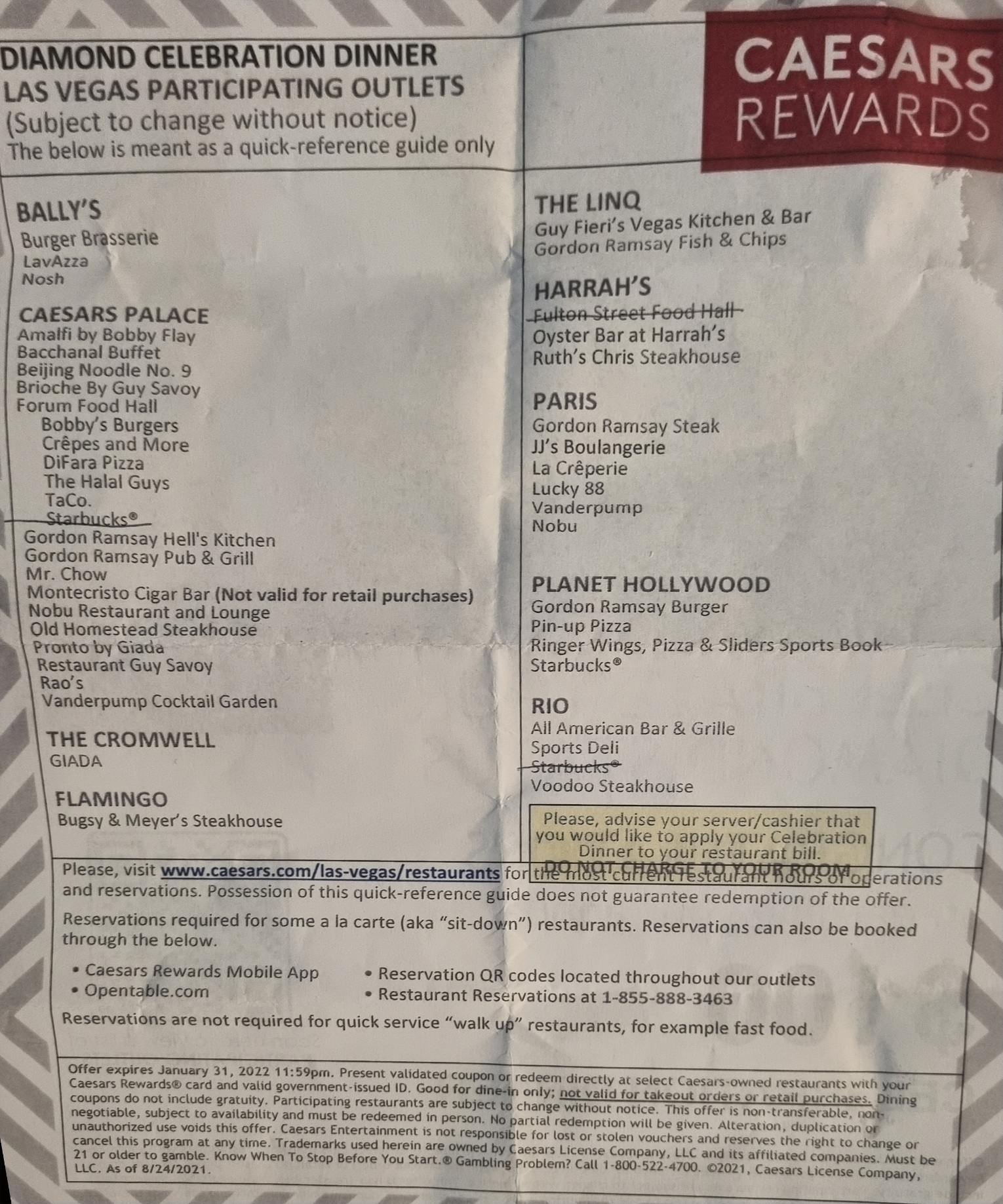 Kreeg nog een mooi overzicht mee, van de restaurants waar je gebruik kan maken van de celebration dinner. Die zal ik hier posten. Wij hebben er 2 dagen van gegeten op de.foodcourt in Ceasars palace. 1 avond Halal Guys ( gezond en heel goed eten) en 1 avond mega pizza's bij Difara's.