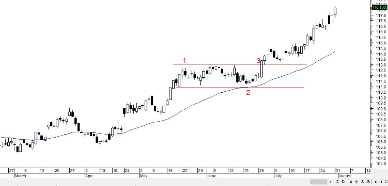 In deze daggrafiek, dus voor de korte termijn, is te zien dat de koers op 23 mei behoorlijk ver boven het 40 daags exponentieel stond (1). Koersen hebben de gewoonte om naar dat gemiddelde terug te keren. Dat kan in een stijgende trend d.m.v. een korte daling, maar in dit geval kwam de koers via een zijwaartse beweging op 20 juni terug bij dat gemiddelde (2). Enkele dagen later op 27 juni volgde de uitbraak uit die zijwaartse beweging en werd de stijgende trend voortgezet (3). Inmiddels staat de koers weer behoorlijk ver boven het 40 daags evg. Vandaar mijn eerdere opmerking dat een pas op de plaats of een lichte daling op korte termijn niet valt uit te sluiten. Die verwachting wordt echter nog niet door de grafiek ondersteund en kan dus nog even uitblijven.