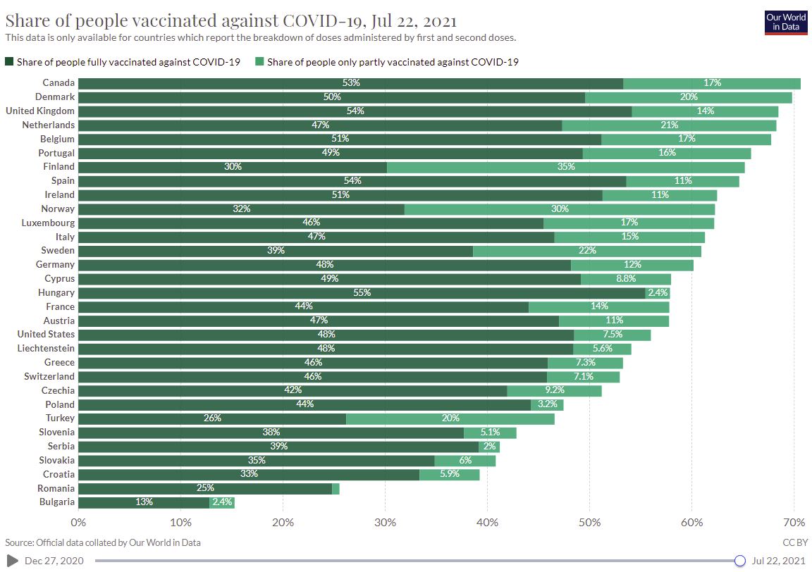 Hieronder een overzichtje van de belangrijkste landen van Europa + Amerika en Canada vwb de vaccinatiegraad per 22 juli 2021. Wat ik mij afvraag: aangezien iedereen nu wel zo'n beetje de kans heeft gehad om in ieder geval de 1e vaccinatie te krijgen (weet niet of dit voor elk land hieronder geldt), zou de vaccinatiegraad nog wel veel hoger worden? Zo zie ik bijv. niet dat Amerika ooit de 70% die het graag wil halen, gaat bereiken.