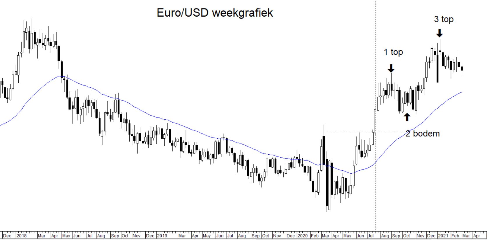 Bij mijn laatste analyse begin maart vorig jaar kende de euro een stijging t.o.v. de dollar. Er was een patroon van hogere bodems en hogere toppen bij een stijgend 40 weeks exponentieel voortschrijdend gemiddelde (evg-40). De verwachting was toen dat de euro verder zou stijgen. Dat bleek echter niet het geval. In onderstaande weekgrafiek is te zien dat de bodem nog wel hoger dan de vorige kwam te liggen. Het verschil was echter niet groot en de koers kwam ook al even onder het evg-40. De daarop volgende stijging resulteerde in een iets lagere top en aan het begin van het derde kwartaal 2021 werd het duidelijk dat er een lagere bodem zou ontstaan. Ook het evg-40 was aan een daling begonnen. Inmiddels is er duidelijk spraken van een dalend evg-40, dalende bodems en dalende toppen en is er in deze grafiek nog geen aanwijzing voor een draaiing van de trend.