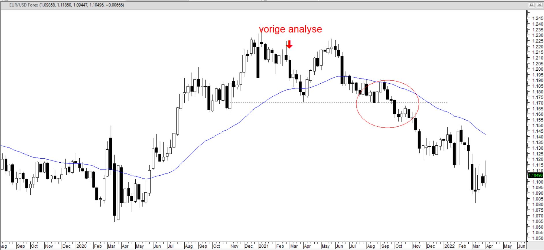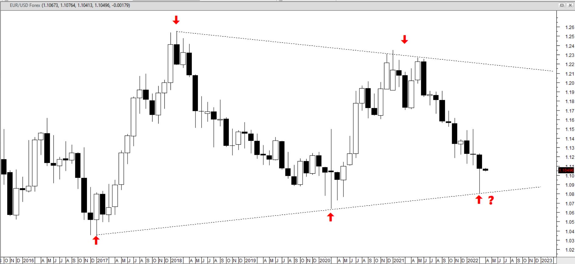 Welke van de twee scenario's gaat het worden? In de technische analyse weegt een maandgrafiek zwaarder dan een weekgrafiek en die weer zwaarder dan een daggrafiek. Voorlopig ga ik daarom uit van een koers boven 1.08. Pas als de koers duidelijk onder de laagste koers van maart 2022 komt, schakel ik over op het scenario van een verdere daling.