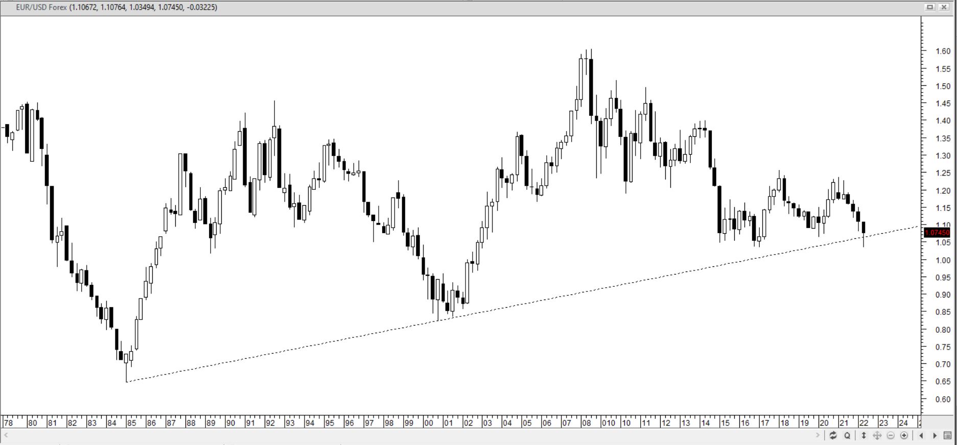 Deze keer begin ik met een kwartaalgrafiek die begint in 1978. Daarin zien we een steunlijn door de bodems van 1985 en 2000. De koers is dit kwartaal wel even onder die lijn geweest maar de lijn is nog niet met een slotkoers doorbroken. Hier zou dus een nieuwe bodem kunnen ontstaan. De laatste jaren is er sprake van een zijwaartse beweging met een ondergrens op 1.035.