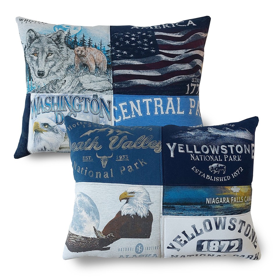 Wilde dit mooie resultaat toch met jullie delen. Mijn man is in april overleden. Zijn grootste hobby was van alle reizen naar Amerika T-shirts meenemen uit de verschillende parken en bestemmingen. Er lag een flinke stapel in de kast. Nu krijgen deze kussens een mooi plaatsje en zo is het een blijvende herinnering van onze mooie reizen naar Amerika.