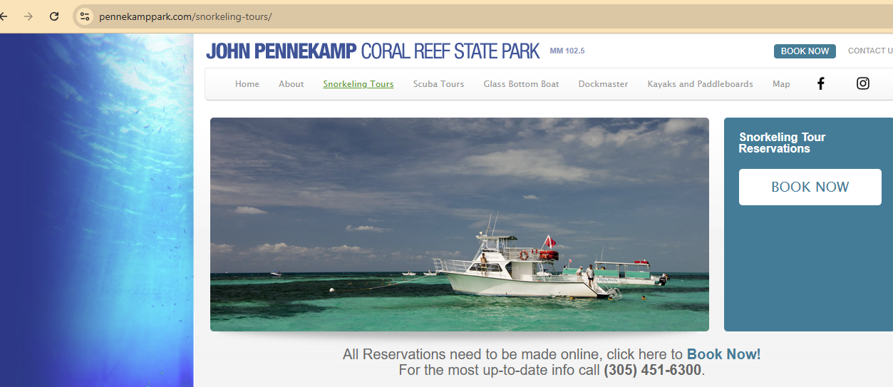 De booking link staat rechtsboven op de pagina van John Pennekamp state park
