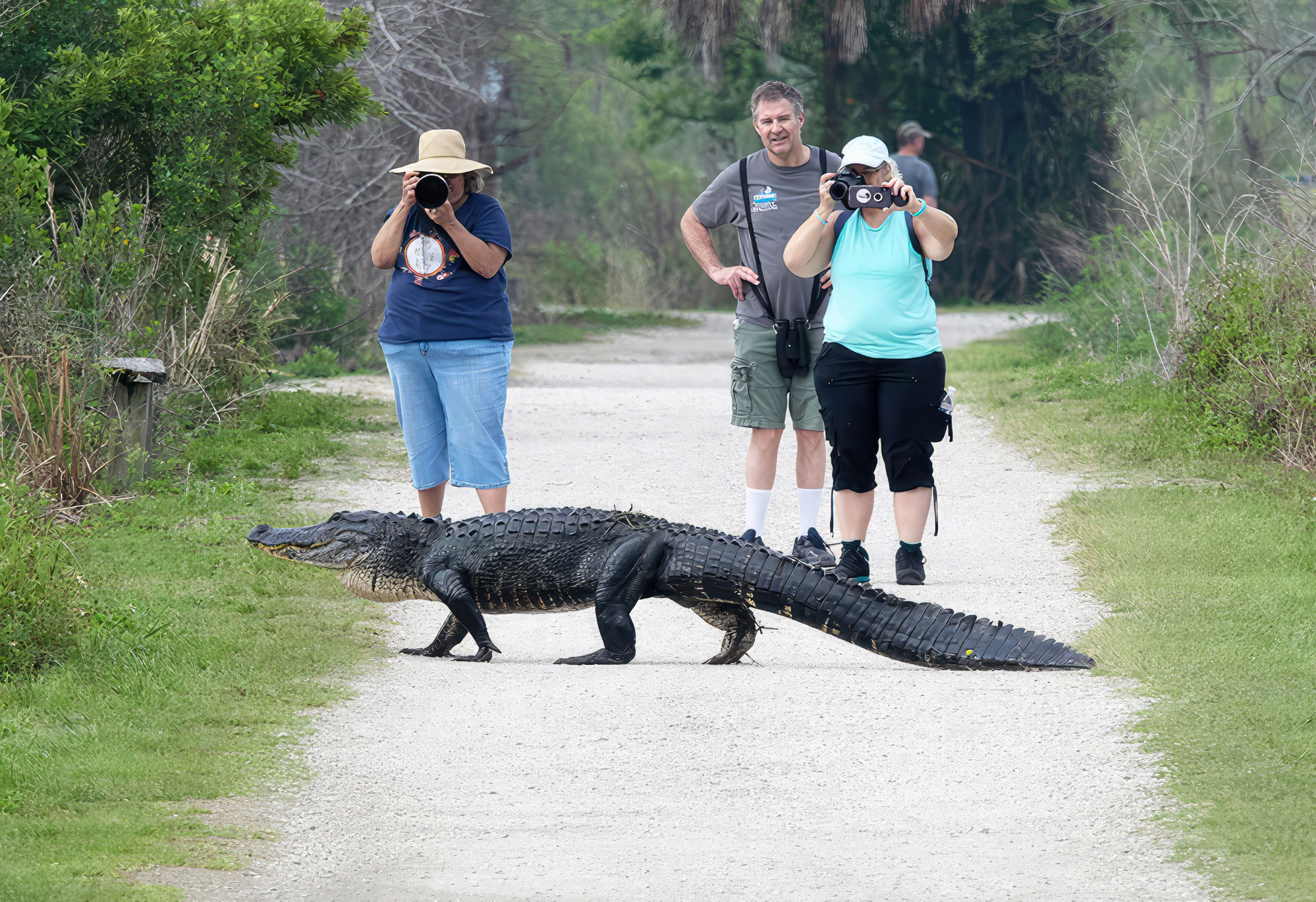 Op de Circle B Bar, mensen dicht op een overstekende Alligator ...