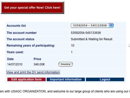 Wel oortjes, ik ben in mijn zoektocht naar info over de GC verschillende sites tegengekomen. Ik ben ook op de site van DV terechtgekomen, en ik wist eigenlijk wel dat de inscrhrijving ook gratis kon. Maar nadien kon ik daar niets meer van terugvinden en kwam ik weer andere sites tegen — een hele hoop van die sites hadden rare adressen en voelden niet koosjer aan, dus die heb ik allemaal overgeslagen. Op de site van USA@org kon ik info aanvragen door online mijn gegevens in te vullen. Dat heb ik dus gedaan, maar niet volledig. En toen begon het getelefoneer. Maar tot nu toe lijkt dat bureau zijn werk wel te doen: ik kan me altijd inloggen en mijn status bekijken (zie afbeelding 13) en als ik klik op "View en print de DV send information" krijg ik volgende info: zie GC entry form 2.jpg (heb even mijn namen eruit gehaald, weet niet of het veilig is om ze te laten staan). Op de site van USA@org verwijzen ze ook vaak naar de site van DV Lotery en in de mail die ik laatst kreeg (28/05), over de herziening van de laatste loterij, stond dit: "Wij verwachten dat de resultaten van het nieuwe selectie proces na 15 Juli 2011 beschikbaar zullen zijn op de DV Entry Status Check website." De DV Entry Status Check website was een link die mij rechtstreeks naar de DV-site bracht.