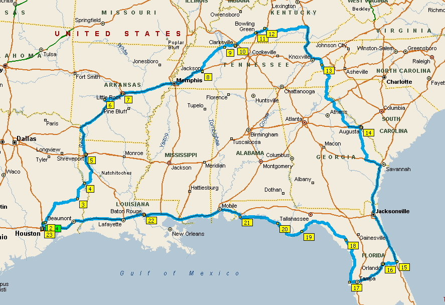 Al heel lang wil ik een trip vanuit Houston naar Florida maken en weer terug naar Houston. Voor deze trip heb ik 16 dagen de tijd, incl. heen- en terugvlucht, dus die dagen hoef je eigenlijk al niet mee te tellen. Het is een ambitieus plan en zeker niet voor iedereen weggelegd maar onderstaande route (zie afbeelding) heb ik in gedachten, om het visueel wat makkelijker te maken. :P Er zitten enkele langere stukken tussen maar de overnachtingsplekken kunnen nog aangepast worden. Op dit moment heb ik zelfs nog 1 dag 'over' en ik weet nog niet waar ik die in ga lassen op de route. De totale route is op dit moment zo'n 3.000 mijl. Wie mij een beetje kent, weet dat ik niet vies ben van langere afstanden. :wink:
