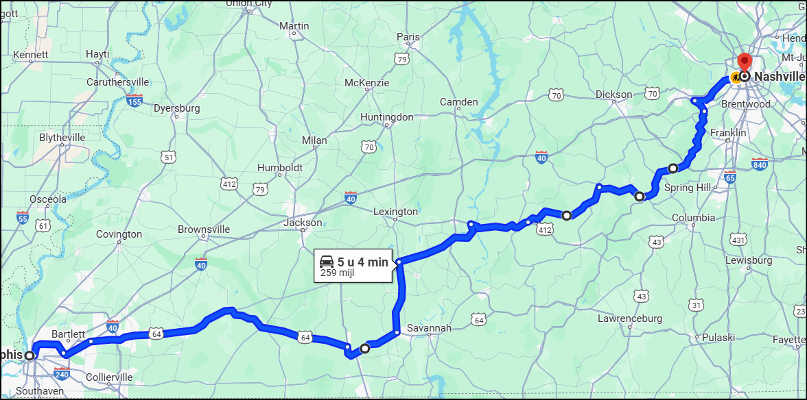 Re: touristische route van Memphis naar Nashville