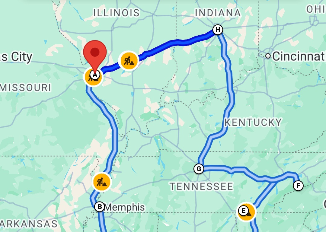 Vanuit daar willen we dus richting Memphis, New Orleans Atlanta etc etc. We komen echter maar niet uit de route voor het bovenste stuk.