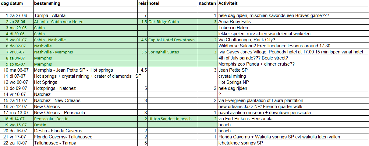 In Nashville en in Memphis hebben we trouwens al een hotelletje geboekt. Beide downtown zodat we alles lopend kunnen doen. Ook de cabin in Helen is geboekt en het hotel in Miramar beach/Destin