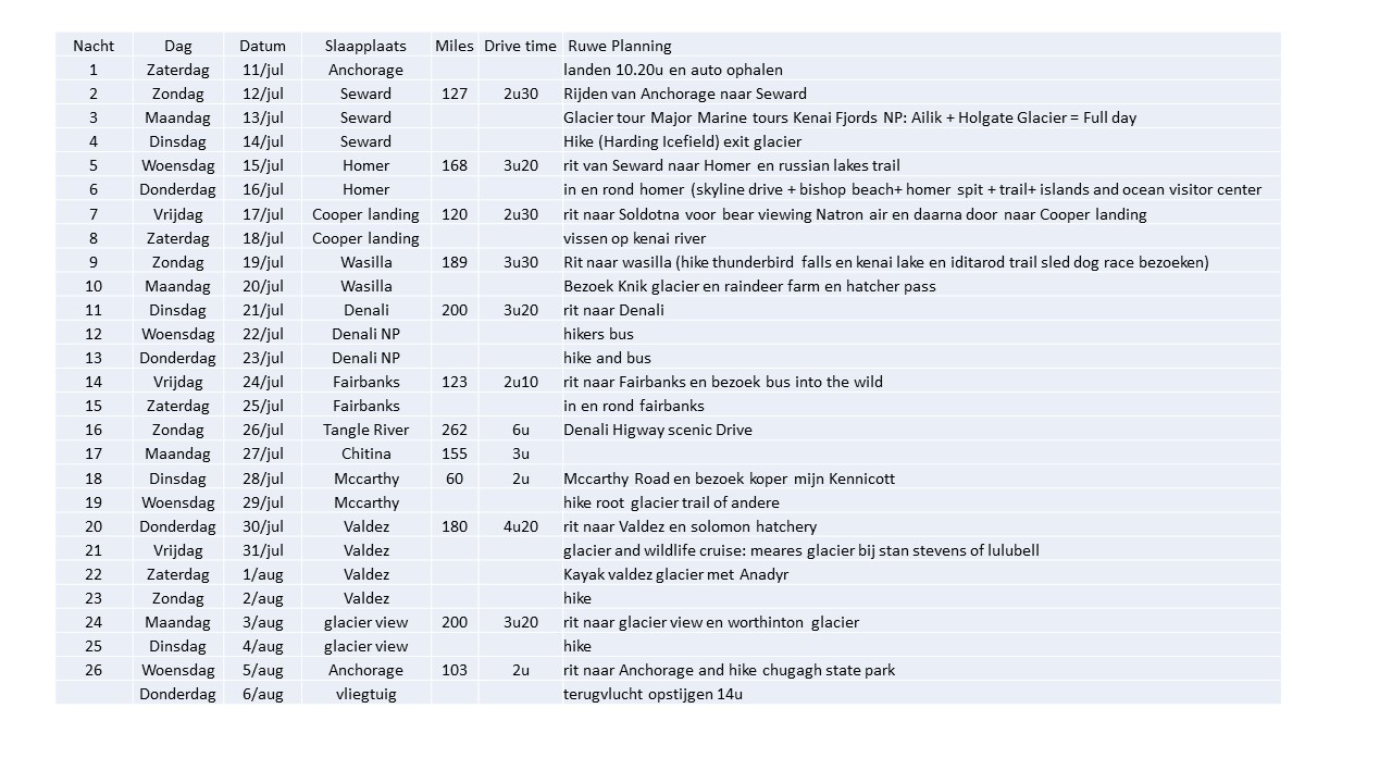 inmiddels ligt alles al een tijdje vast (vlucht, SUV, alle overnachtingen, tours valdez en seward, hiking bus denali, fishing trip on kenai river, glacier kayak en bear viewing) en jawel, roadboek ook