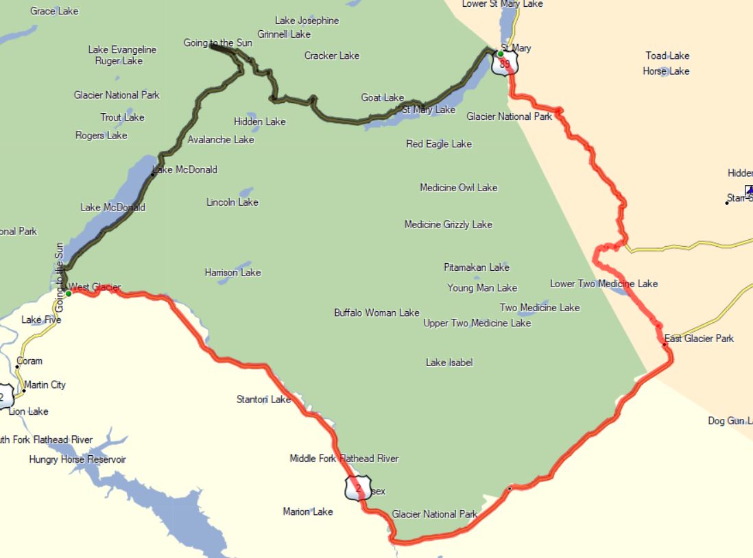 2) Twee overnachtingen in St Mary. Je rijdt GTTSR (zwart) heen en weer of via de rode route terug. Wij reden in 2008 (een groot gedeelte van) die rode route op weg naar Eagle Falls in de Two Medicine Valley. Wat vond ik daarvan? Mwahh, niet onaardig maar ook niet een route die een onvergetelijke indruk achterliet.
