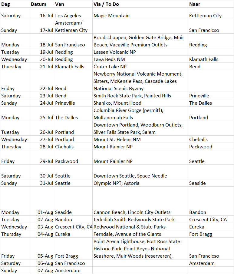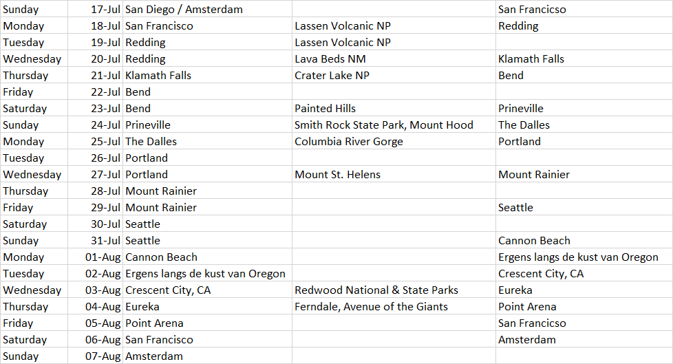 In de twee week van juli bezoek ik vanwege werk een conferentie in San Diego. Daarna vlieg/rijd ik richting SFO, waar mijn moeder dan ook heen komt. Vanuit daar willen we een rondje Noord California, Oregon en Washington doen. SF is bekend, net als Seattle en Olympic & Mnt Rainier. De rest is nieuw. We zitten vast aan de reisdata (vanwege de conferentie) en ook de vertreklocatie ligt min of meer vast, alhoewel ik nog geen tickets heb geboekt. In eerdere plannen zat ook Canada verweven, dat doen we nu niet, teveel extra onzekerheden met COVID.