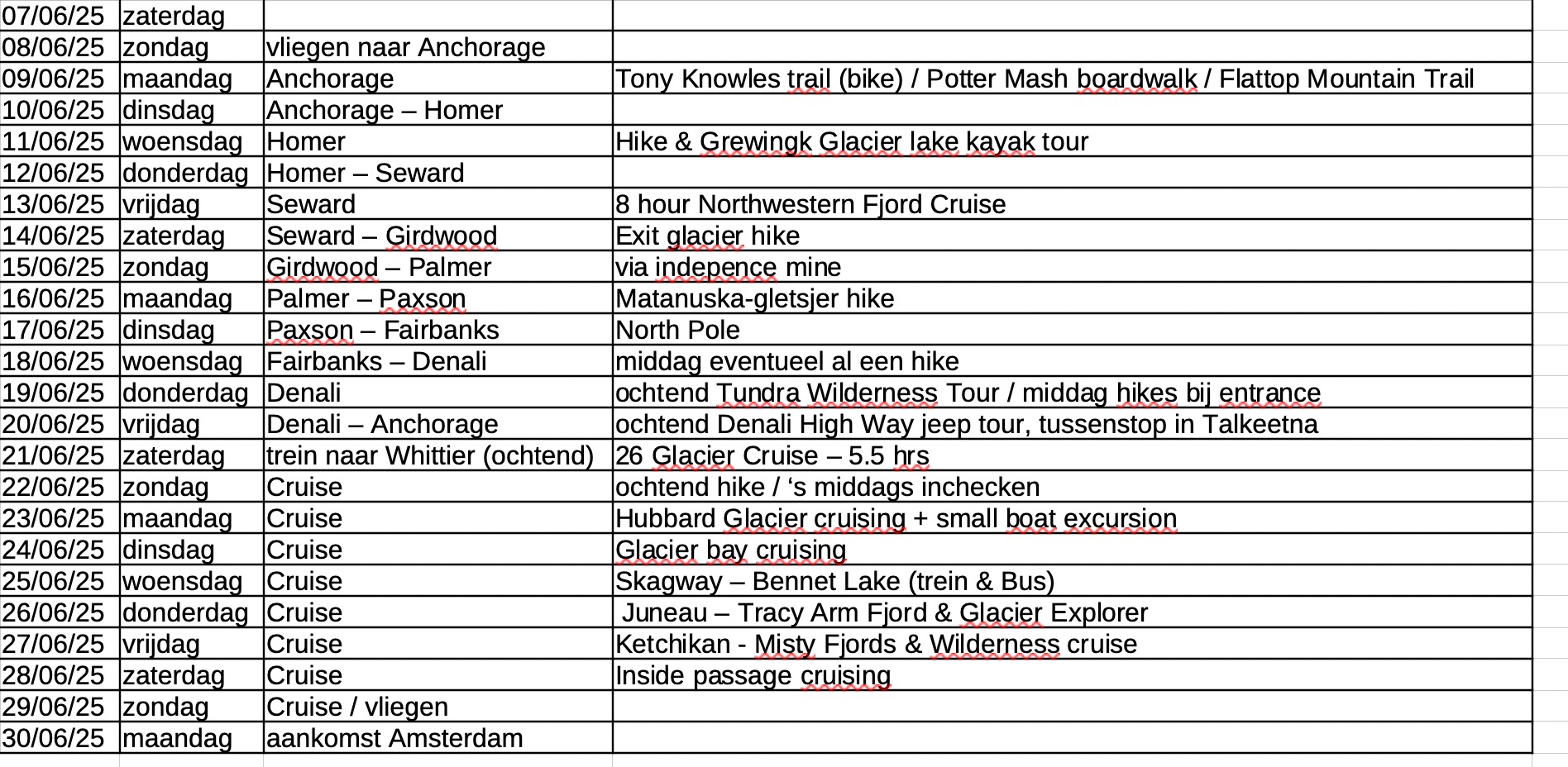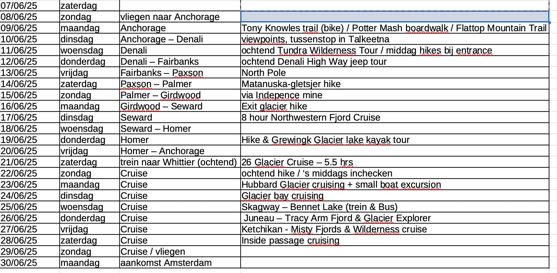 We gaan een 7-daagse cruise doen van Whittier naar Vancouver (cruisen bij Hubbard Glacier en Glacier Bay, Skagway, Juneau & Ketchikan). Deze is al geboekt en vertrekt 22 juni 2025.