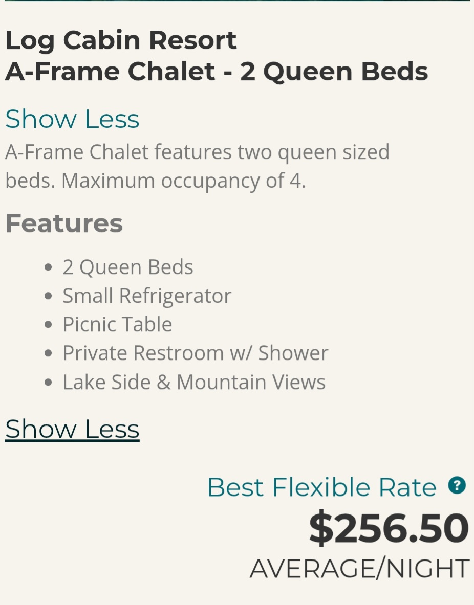In 2022 in de Log Cabin Resort geslapen (Port Angeles), in juli destijds 4 nachten voor USD 90 per nacht (een supergave cabin met zicht op het meer, wel een gedeelde badkamer en toilet in een apart gebouw). Was echt een hele mooie plek.