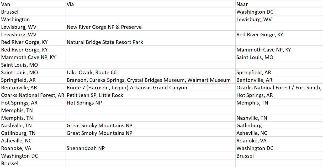 Washington DC, Shanandoah, Nashville en Smokies zijn we al geweest, daarom komen die wat kort voor in dit schema.