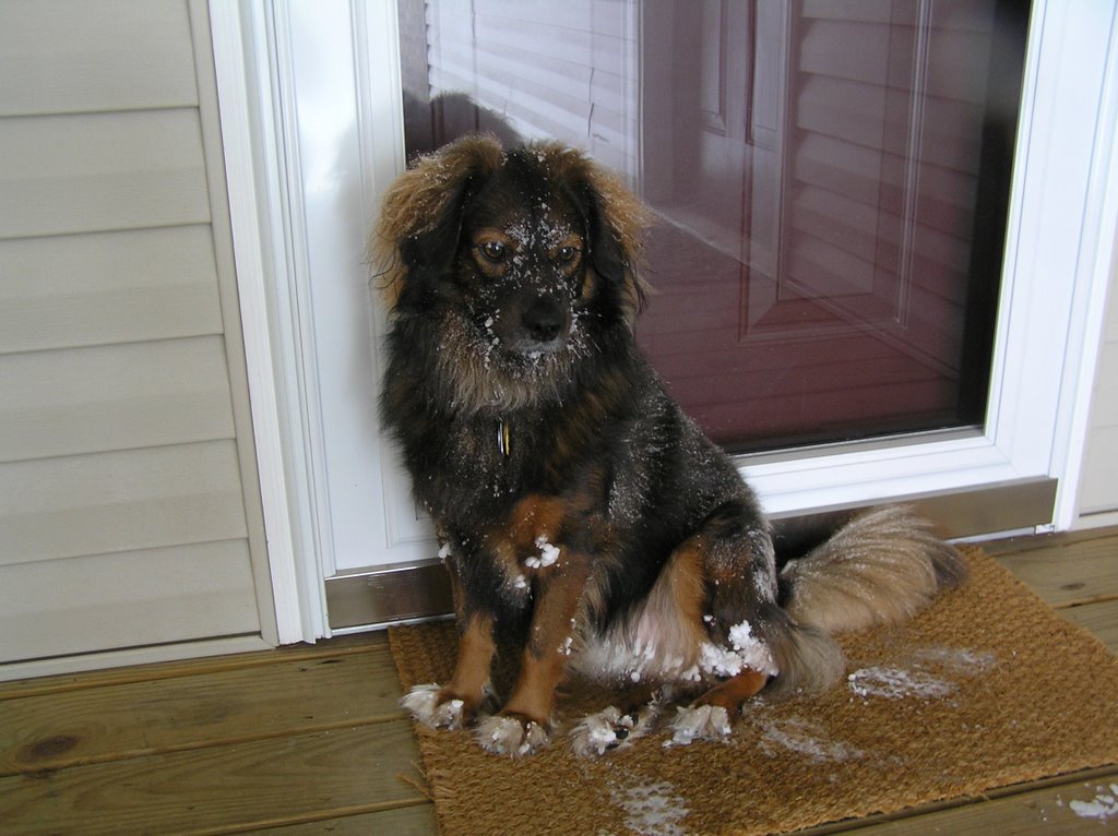 Nee hoor, hij had er geen last van. Ik heb hem meteen afgedroogd en de ijsklompjes smolten vrijwel meteen in de warme flat.