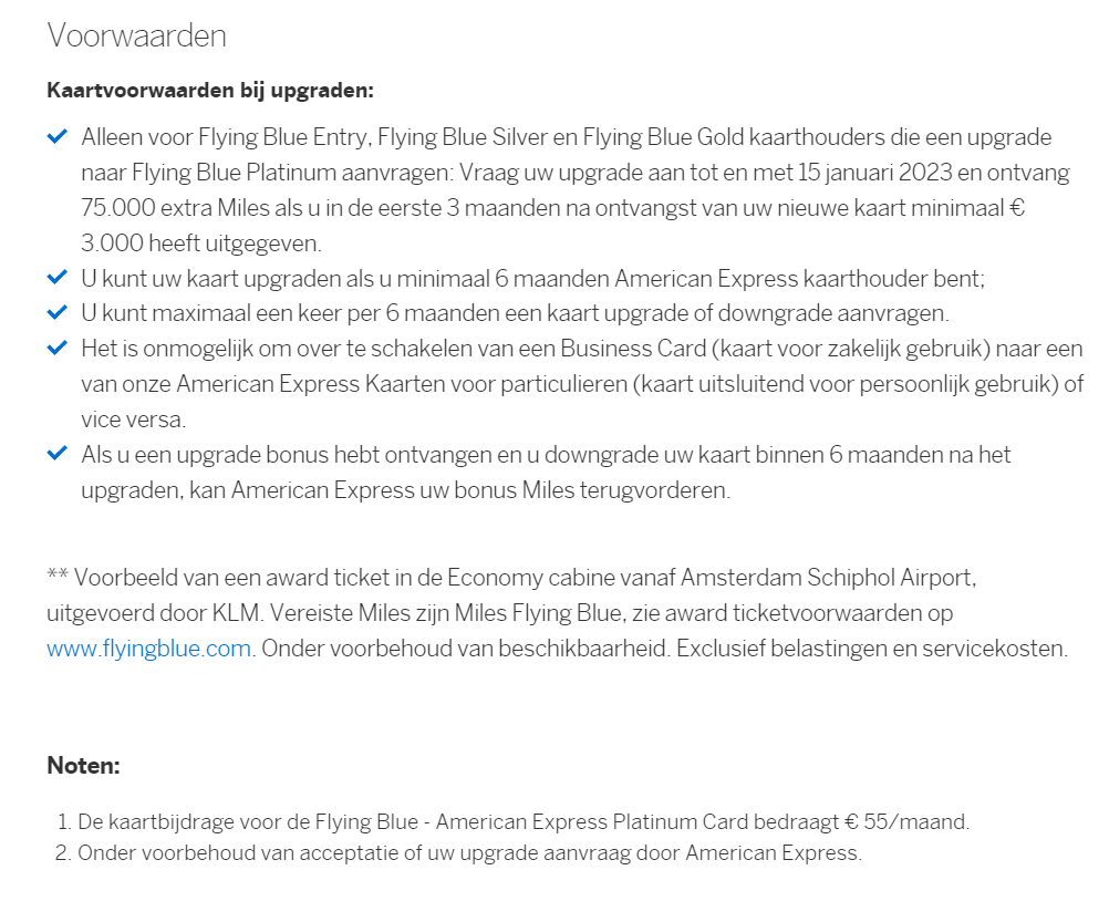 Ik heb zelf de American Express FB Gold kaart en wilde in eerste instantie ook upgrade naar de platinum voor de 75.000 Miles. Echter heb ik ervoor gekozen om te wachten tot na maart (dan ontvang ik mijn jaarlijkse 30xp) om te upgraden. In dat geval ontvang ik ook nog de 60xp van de platinum kaart. Echter is dat enkel van belang als je status wilt worden/ blijven bij KLM Flying Blue. Hopelijk is hiermee je vraag beantwoord