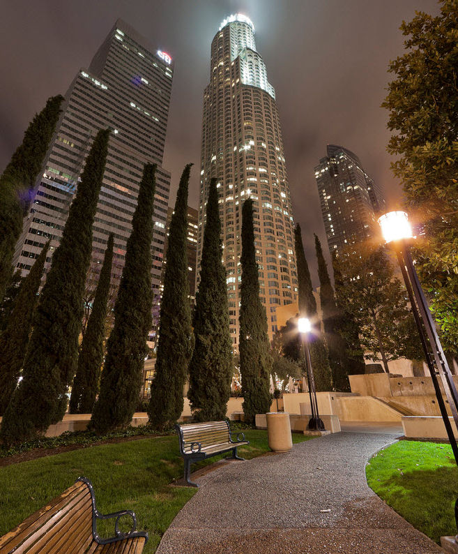 Het is niet zelf gemaakt, maar toen ik vanmiddag mijn wandelroute door downtown LA een beetje aan het uitzoeken was kwam ik deze foto tegen. Met het licht op de wolken erboven en het parkje onderaan geeft het wel een mooi beeld. Overigens zal dit gebouw over een aantal jaren (2017 als het volgens plan gaat) niet meer het hoogste gebouw ten westen van Chicago zijn, want de Wilshire Grand Tower zal net iets hoger worden.