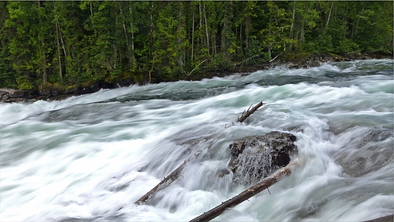 door 2 foto's samen te voegen konden we bekomen dat het water op de traagst stromende plaatsen (zoals op de rots op de voorgrond) nog vloeibaar blijft en de snelst stromende plaatsen engelenhaar worden...