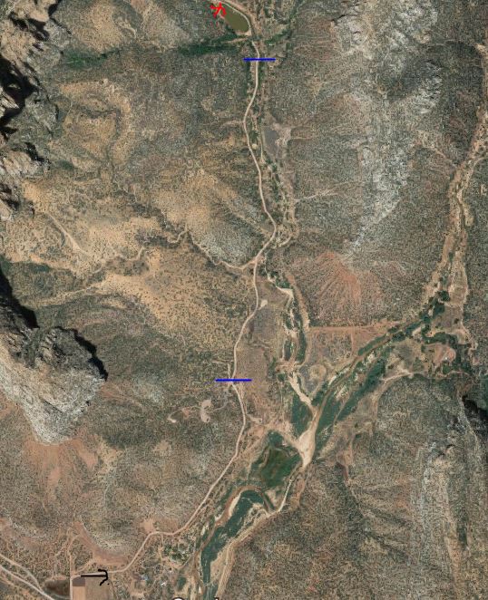 Blauwe lijnen: stuk hiertussen lag er slecht bij (niet doenbaar met camper). De rest (deel ervoor en deel erna) viel goed mee. Het stuk tussen de blauwe lijnen bedraagt zo'n 1 mijl. Mogelijks kan je de camper parkeren ergens voor het blauwe deel en dan dat deel te voet doen. Is dan wel een saai stuk (en in het terugkeren in de volle zon niet te onderschatten (wel volledig vlak)). Wij hadden de dirt road ernaar toe de dag ervoor al eens bekeken. De dagen voor onze hike had het vee geregend en we zagen dat een stuk van de baan was weggespoeld (vandaar de bulldozer) maar de dag erop viel het uiteindelijk wel goed mee.