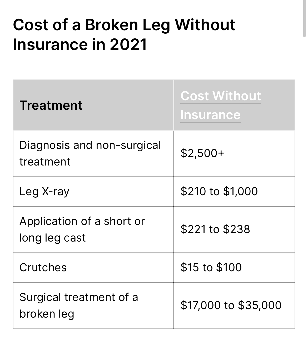 Ik werp maar iets op om concreet te zijn; een gebroken been, de meest voorkomende kwetsuur op reis...hoeveel kost de hele behandeling (diagnose tem ingipsen) ongeveer in de VS?