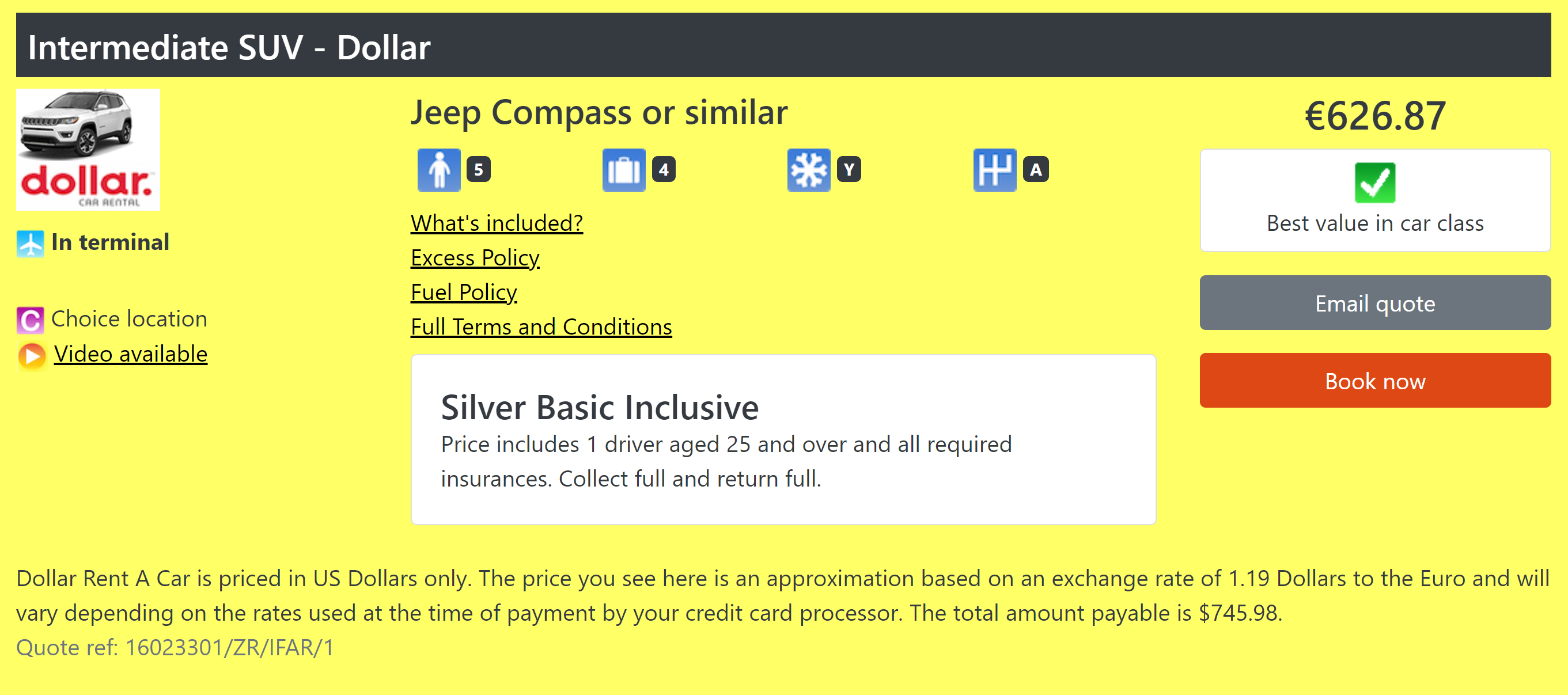 (bedenk dat je de auto altijd op hetzelfde tijdstip of eerder moet inleveren: anders wordt een hele dag extra berekend). Holidaycars.com komt duurder uit.